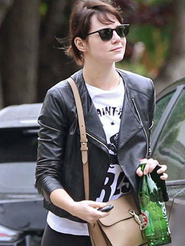 Worn by Emma Stone at Intense Workout Black Leather Jacket