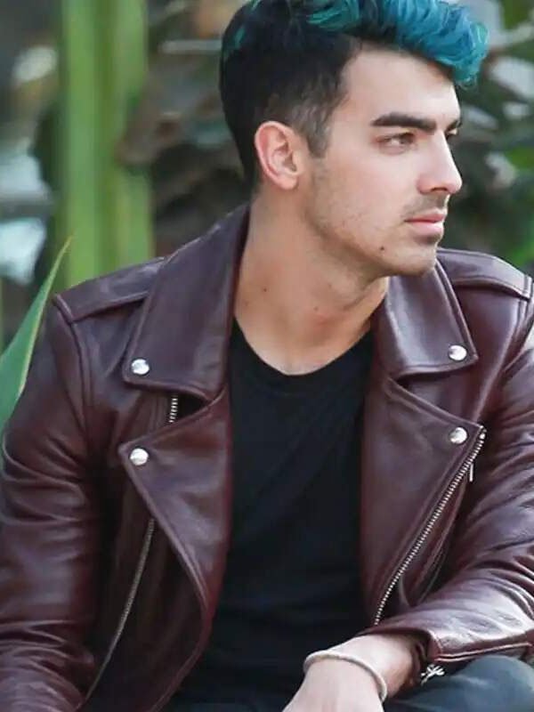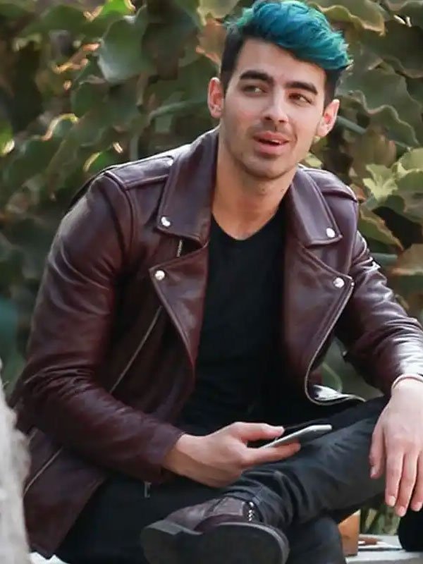 Joe Jonas With his Dyed Hair and Wearing Burgundy Leather Jacket