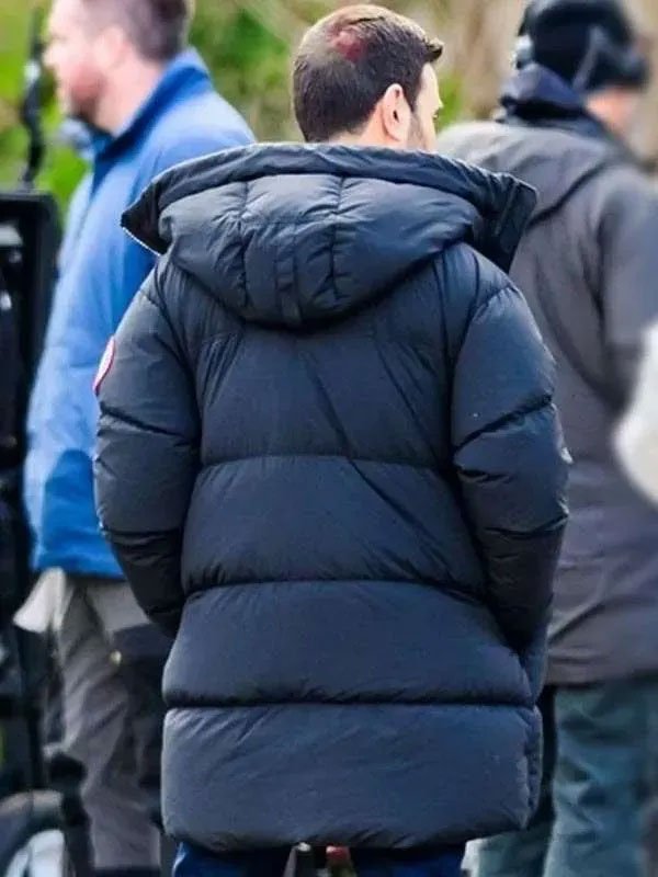 Brett Goldstein Office Romance Movie 2025 Black Puffer Hooded Coat