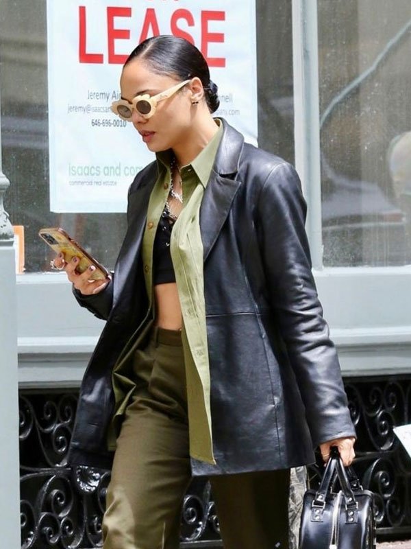 Tessa Thompson Street Style in NYC Black Leather Blazer