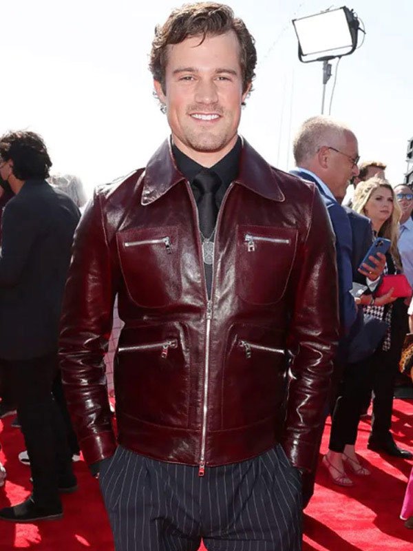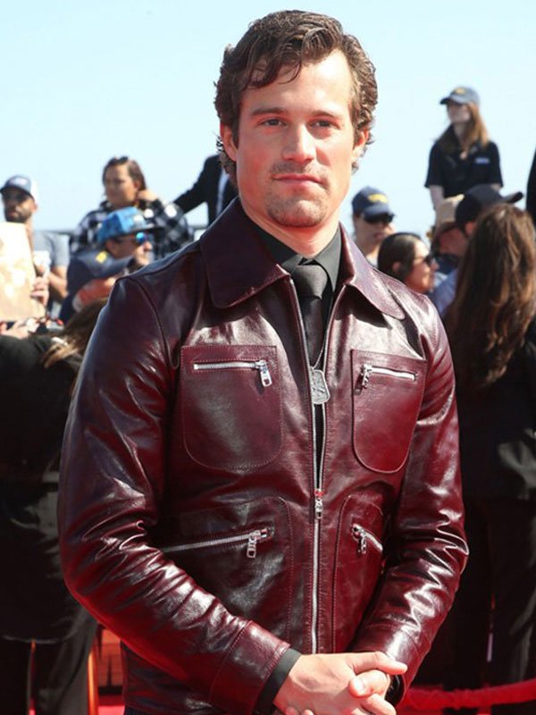 Jake Picking Top Gun Maverick Movie Premiere Maroon Leather Jacket